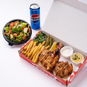2 طاووق بالاعشاب, 2 سبايسي طاووق, 2 كلاسك طاووق, 4 كباب حلبي, 4 كفتا لبنانية, 2 عرايس, 1 دجاج بدون عظم, 1 حمص, 1 تبولة, 1 فتوش, 1 متبل, بطاطا مقلية, ثوم, 2 بيبسي حجم كبير